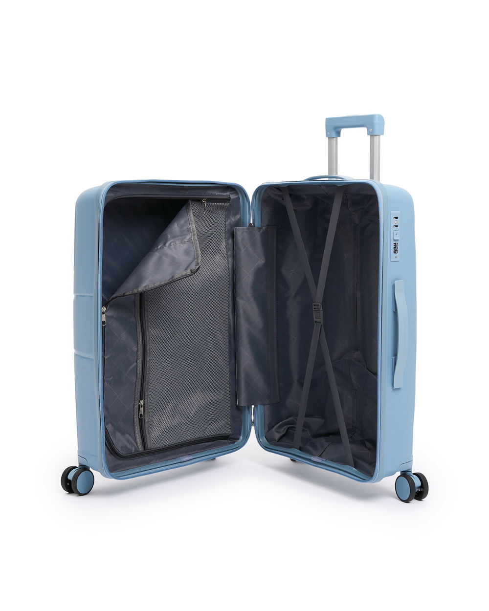 Внутри чемодан разделен молнией на два отделения, также имеются фиксирующие х-образные ремни для удобства укладки вашего багажа.