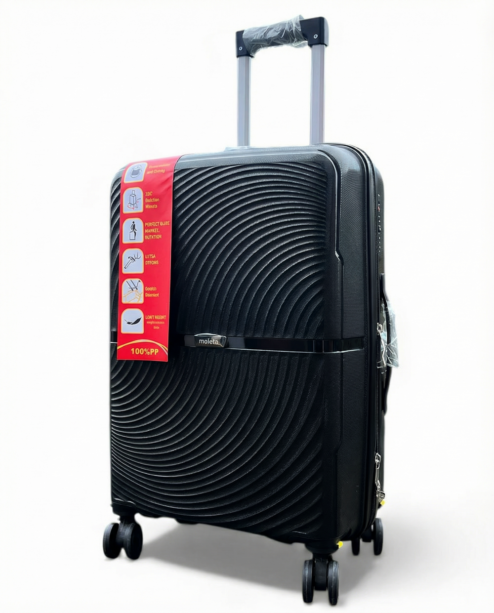 Конструкцией чемодана предусмотрена выдвижная телескопическая ручка, изготовленная из стали, которая фиксируется в нескольких положениях для удобства использования людьми разного роста. Для переноски чемодана имеются две резиновые противоскользящие ручки, расположенные сверху и сбоку.